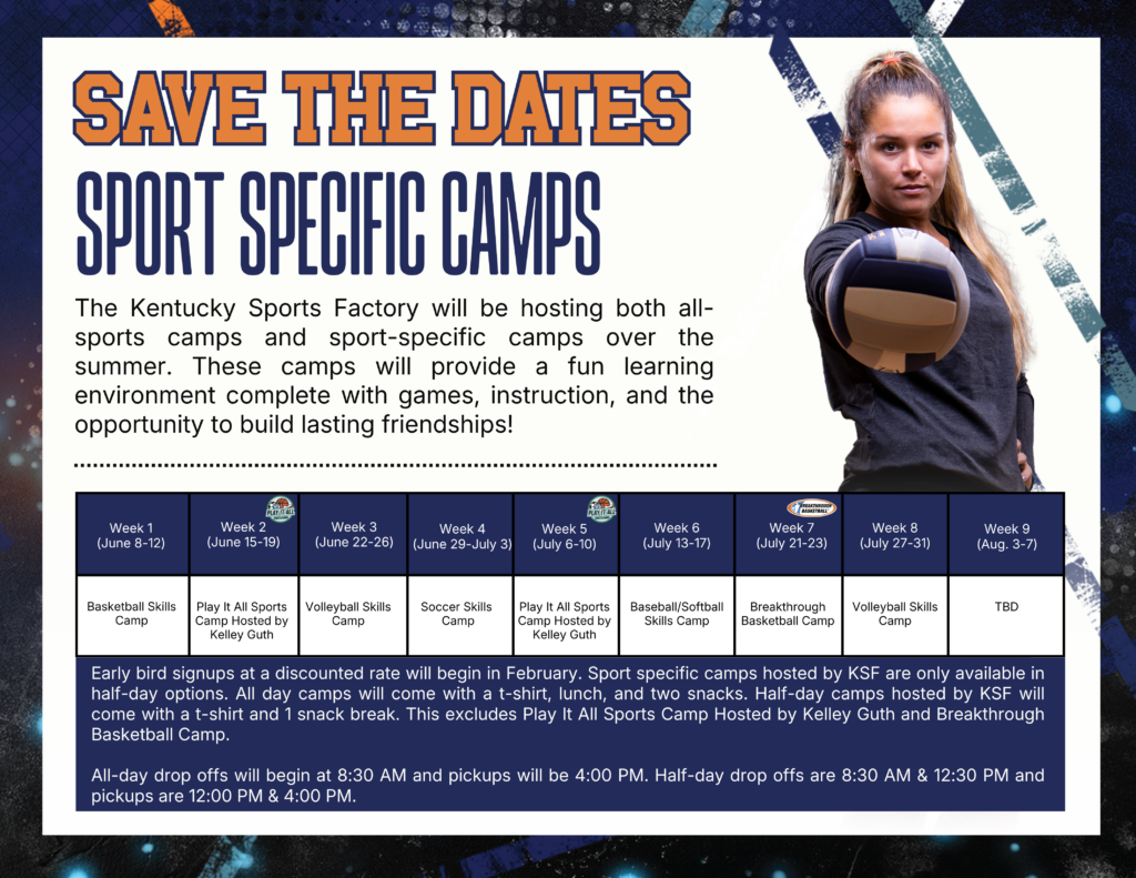 Summer camps are coming to the Kentucky Sports Factory! We’ll be hosting both Summer Sports Camp and Sport-Specific Camps throughout the summer, offering a fun, engaging environment with games, skill instruction, and opportunities to build lasting friendships.