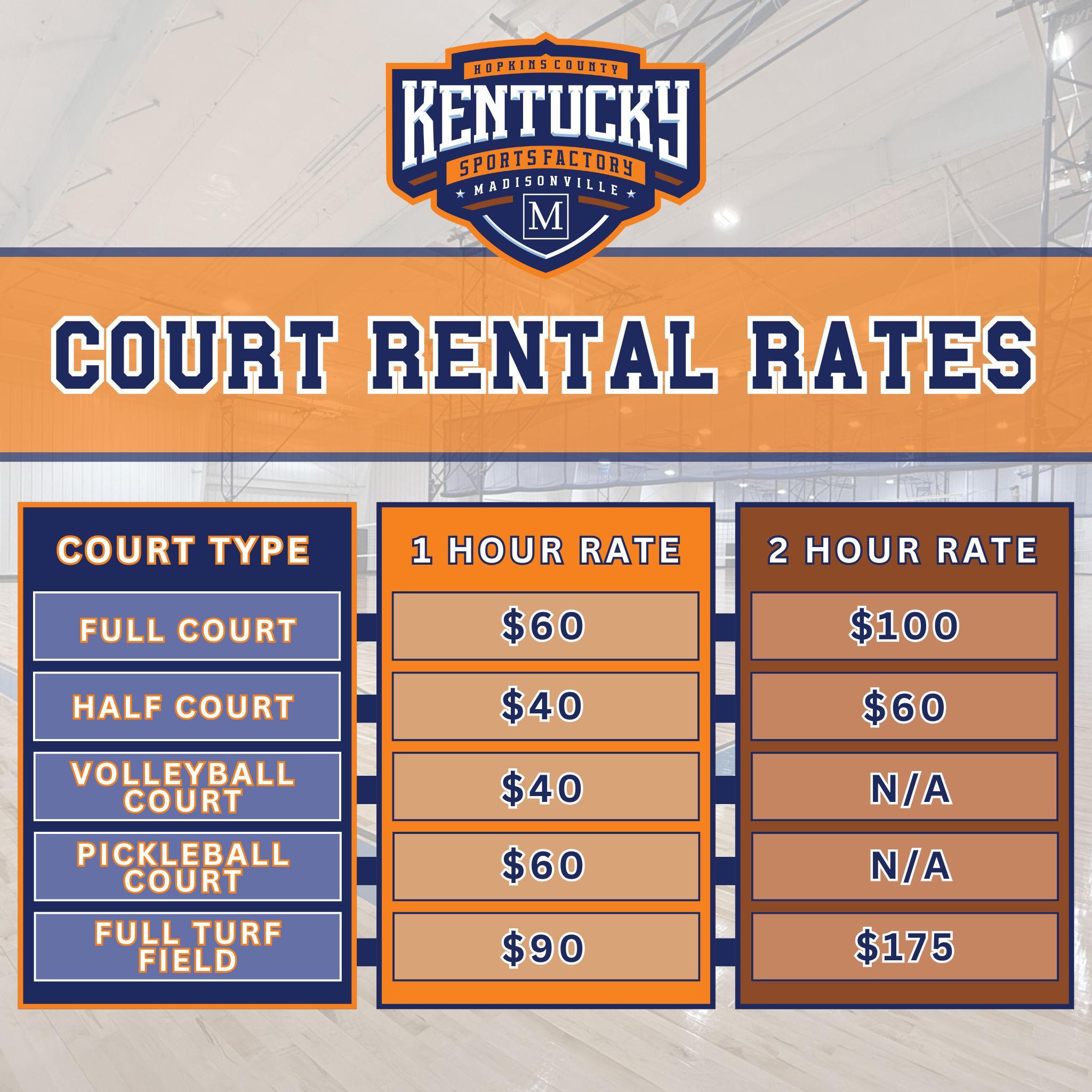 The Kentucky Sports Factory is your go-to destination for sports and recreation in Madisonville, KY. Featuring top-notch basketball, volleyball, and pickleball courts, along with a 60-yard turf field, our facility is perfect for athletes of all levels. Whether you’re hosting a tournament, practicing with your team, or just looking to stay active, we offer flexible court rental options to meet your needs. Come experience the ultimate sports environment in a space designed for champions!